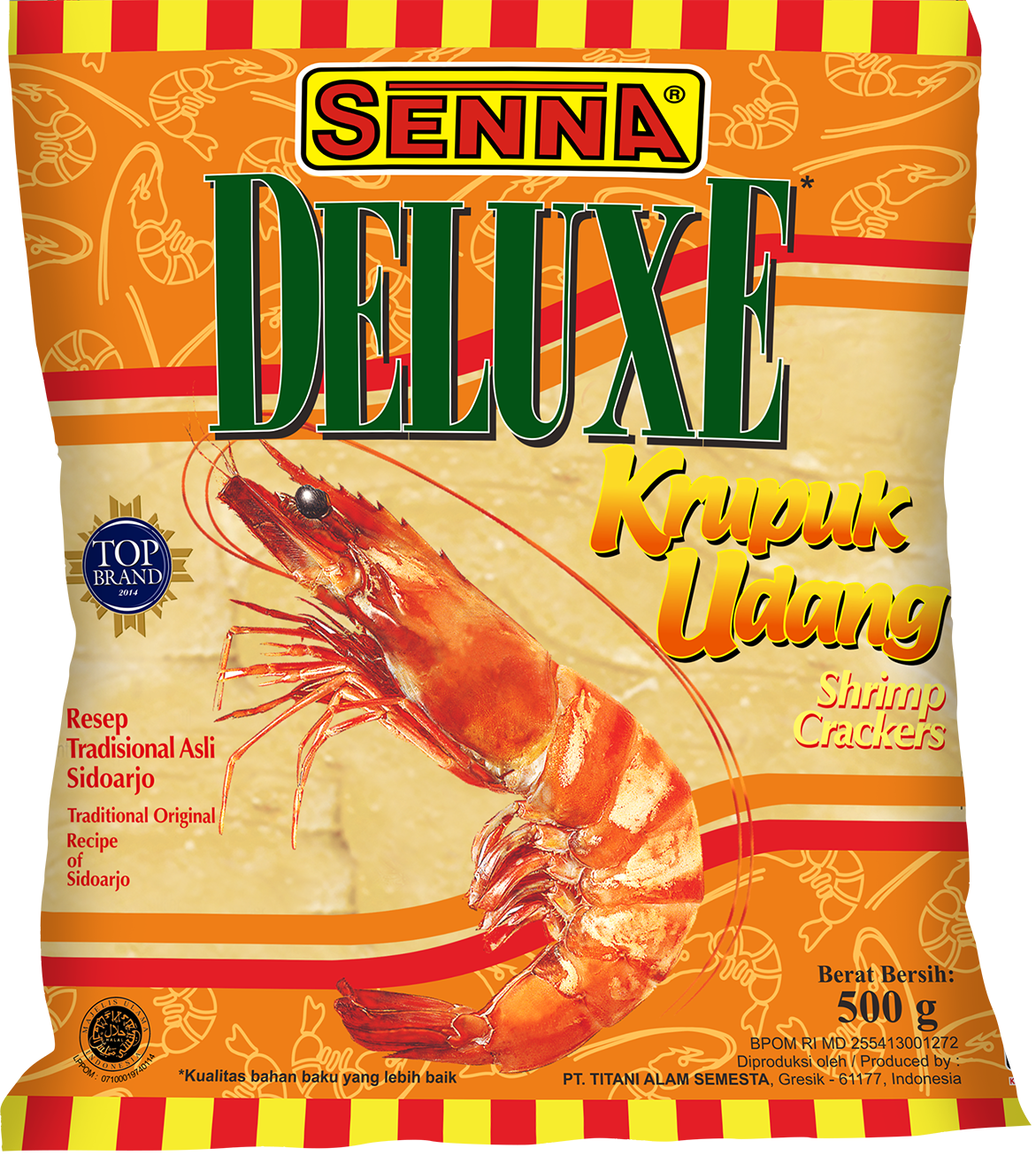 Krupuk Senna Deluxe rasa udang 500 gram hadir dengan tampilan baru yaitu dengan kemasan bantal (sebelumnya berbentuk guling) dan ditunjang dengan bahan packaging yang food grade sehingga tetap menjaga kualitas dari produk ini. Kadar udang pada Krupuk Senna Deluxe adalah sedang dengan rasa sedikit manis).