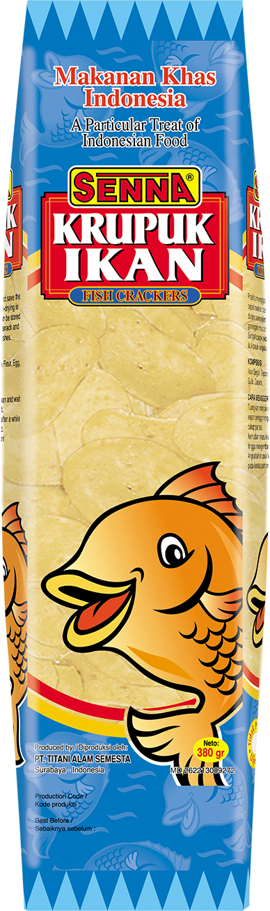 Krupuk Senna Ikan 380 gram terbuat dari Ikan Tengiri dengan kadar ikan sedang.