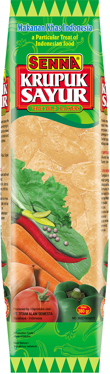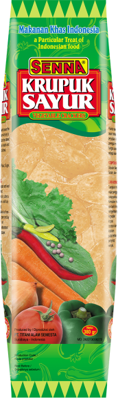 Krupuk Senna Sayur 380 gram terbuat dari sayur-sayuran segar dan bisa dikonsumsi oleh vegetarian.